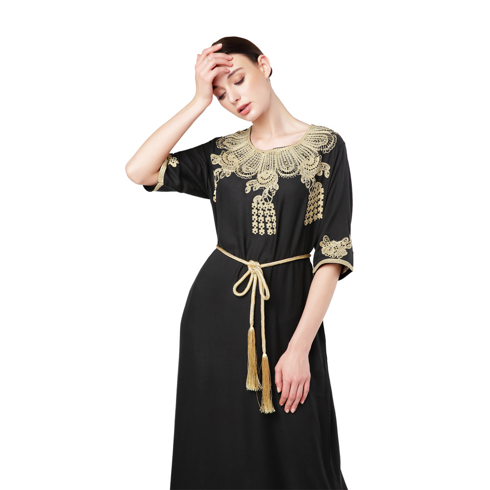 Türkiye Muslim Women’s Embroidery Lace up Short Sleeve Abaya Robe Dubai Swing Dress Middle East Style